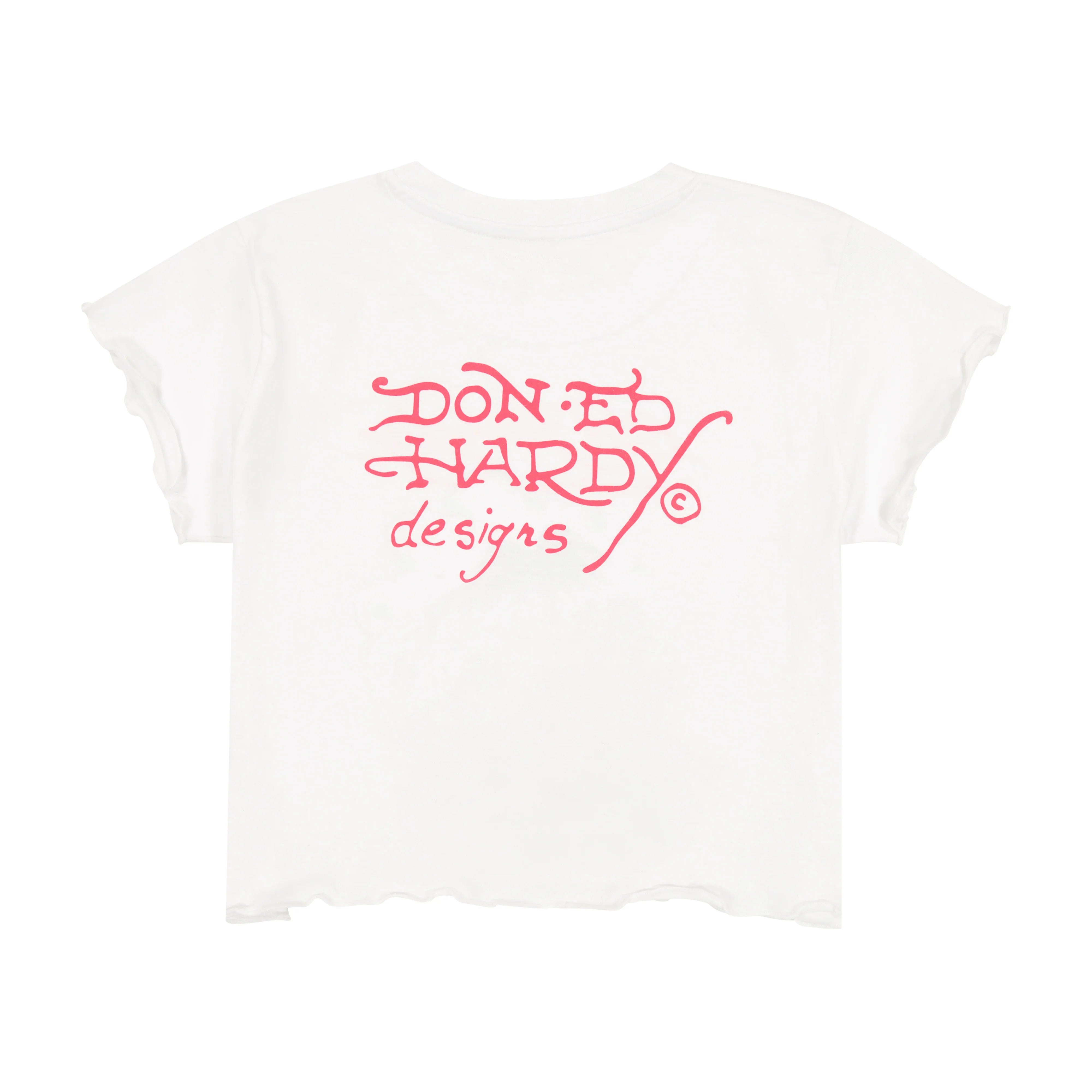 100% cotton cropped baby tee cut with a lettuce edge trim. Features a tropical scene graphic and complete with a pink “Ed Hardy by Kim Petras” logo.